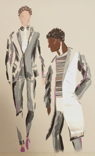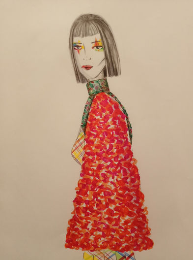 This page shows my progress within tasks that explore womenswear and menswear, body figures and proportions as well as accessories. This artwork has been developed using a range of materials such as markers, gouache paint, watercolours, pencil and collage.